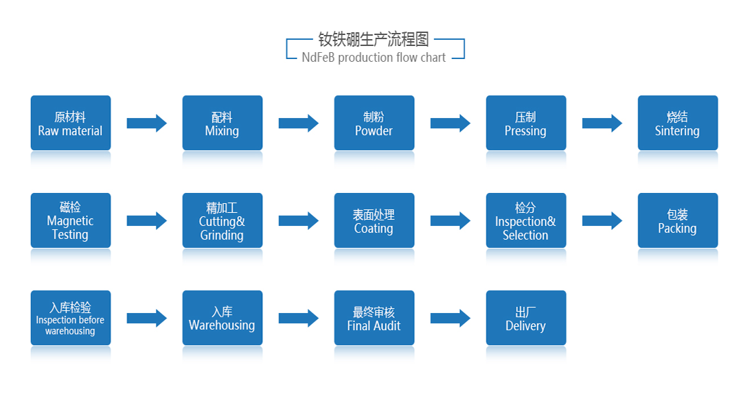 工藝流程:配料 → 熔煉制錠/甩帶→ 制粉 → 壓型 → 燒結回火 → 磁性檢測 →磨加工 → 銷(xiāo)切加工 → 電鍍 → 成品。 其中配料是基礎,燒結回火是關(guān)鍵。