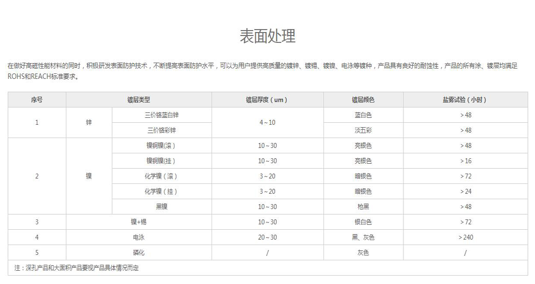 為了避免腐蝕的損害,使用時(shí)需要在永磁材料表面做保護處理,例如用金、鎳、鋅、錫進(jìn)行電鍍,以及表面噴涂環(huán)氧樹(shù)脂等。     釹鐵硼分為燒結釹鐵硼和粘結釹鐵硼兩種,粘結釹鐵硼各個(gè)方向都有磁性,耐腐蝕;而燒結釹鐵硼因易腐蝕,表面需鍍層,一般有鍍鋅、鎳、環(huán)保鋅、環(huán)保鎳、鎳銅鎳、環(huán)保鎳銅鎳等。而燒結釹鐵硼一般分軸向充磁與徑向充磁,根據所需要的工作面來(lái)定。